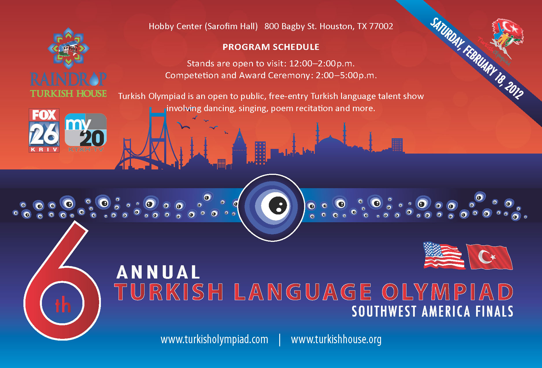 Houston’da faaliyet gösteren Raindrop Türkevi yetkilileri, “6. Türkçe Olimpiyatı ABD Güney Batı Finalleri”nin 18 Şubat 2012 Cumartesi günü 14:00 – 17:00 saatleri arasında “Hobby Center Sarofim Hall”da (800 Bagby St, Houston, TX 77002) gerçekleştirileceğini bildirerek, tüm vatandaşlarımızın katılımını beklediklerini ifade etmişlerdir. Programa ilişkin ayrıntılı bilgiye http://turkisholympiad.com/ internet sitesinden ulaşılabilir.