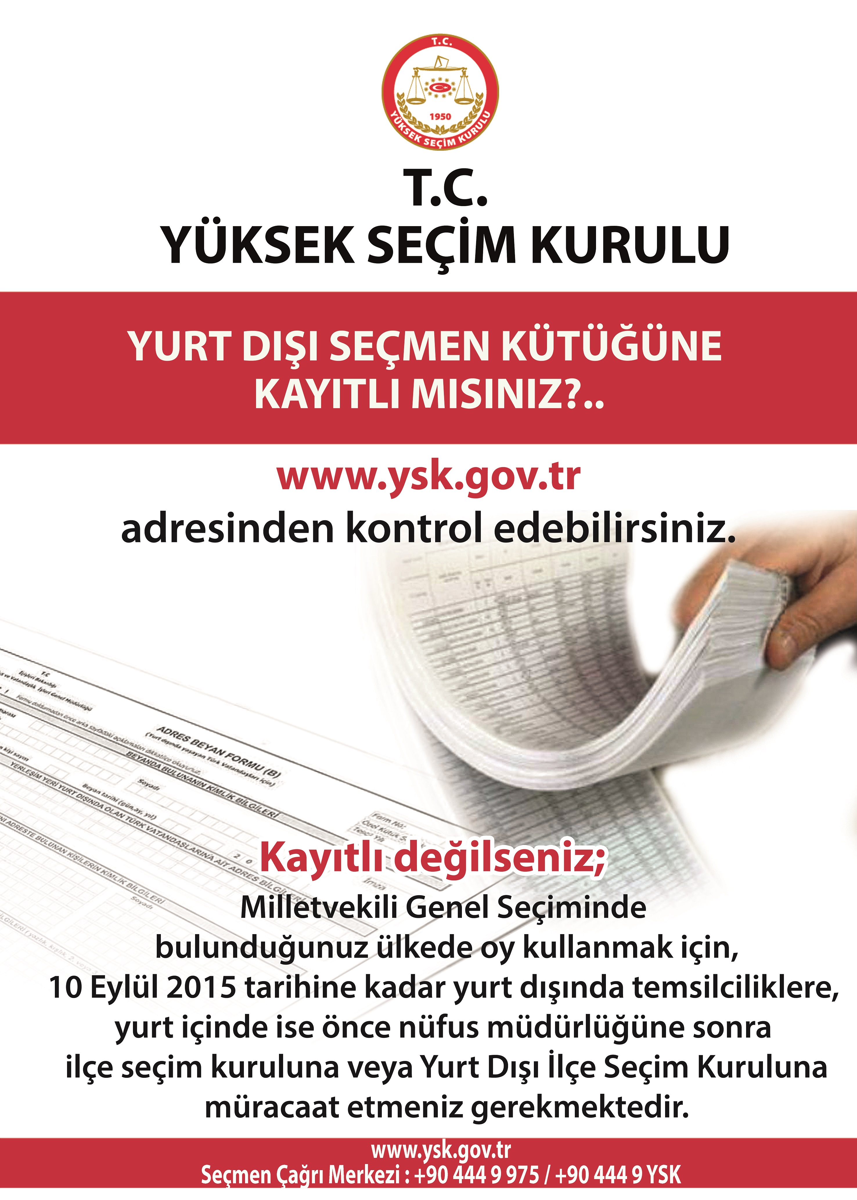 26. Dönem Milletvekili Genel Seçimlerinde yurtdışında yaşayan seçmenlerin bulundukları ülkelerde oy vermelerini teminen yapılan hazırlıklar kapsamında, Yüksek Seçim Kurulu tarafından hazırlanan yurtdışı seçmen bilgilendirme broşür ve afişlerine ekteki dosyalardan, kamu spotlarına ise aşağıda kayıtlı bağlantı adreslerinden ulaşılması mümkündür.